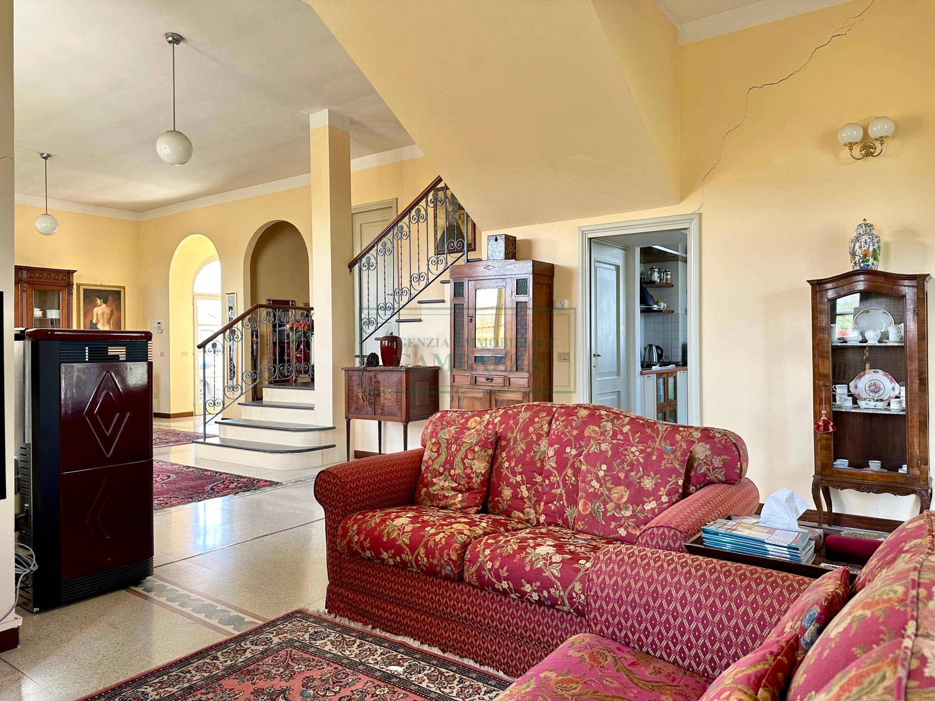 Completano la proprietà una doppia autorimessa di 35 metri quadrati, un impianto di allarme con telecamere, persiane in alluminio, cancello elettrico, addolcitore e aria condizionata al piano terreno con due split.